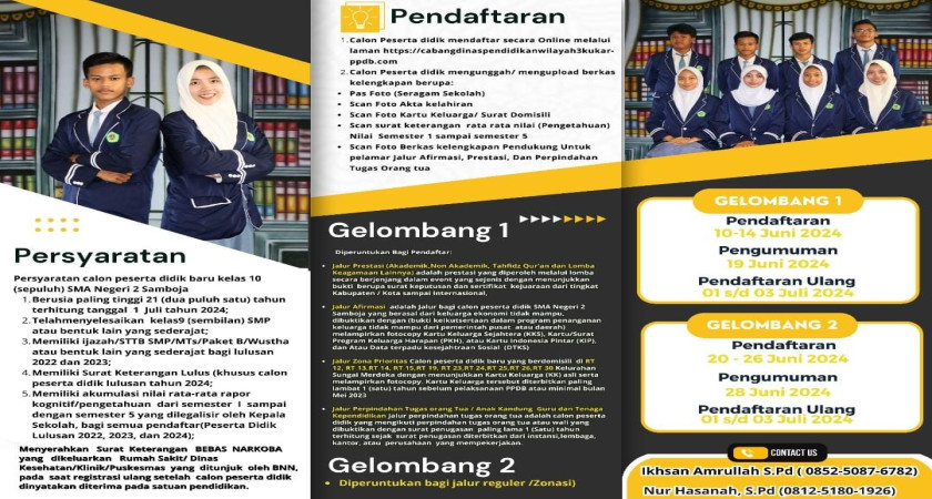 PENDAFTARAN DI SMA N 2 SAMBOJA Gelombang 1 JALUR PENDAFTARAN Pendaftaran Gelombang 1 di mulai Tanggal 10 juni-14 Juni 2024 Pengumuman Gelombang 1 19 Juni 2024 Gelombang